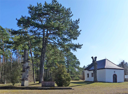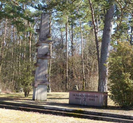 Denkmal für die 14. Panzerdivision im 2. Weltkrieg neben der Straßenkapelle von Kühlsheim. In die Quersteine des