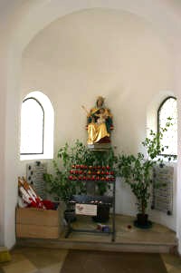 Im Eingangsbereich der Kirche zwei Marmortafeln mit Namen und Bild der Gefallenen.