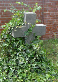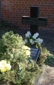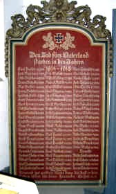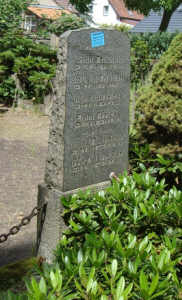 Stele neben der Kirche mit drei Namensplatten (eine abgefallen) und Wandtafel stehend im Vorraum der Kirche (enthalten die gleichen Namen).