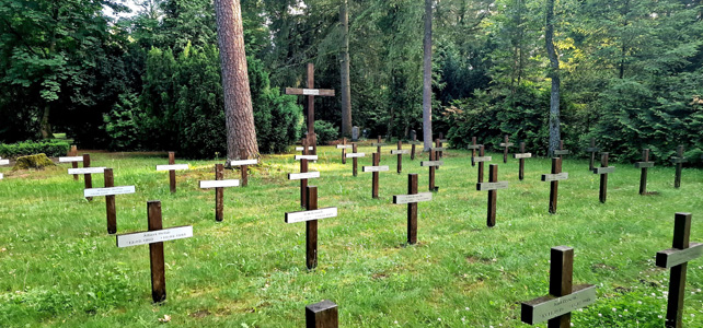 Die Holzkreuze der Kriegsgräberstätte des 2. Weltkriegs haben nach 2012 neue Metallplatten bekommen,