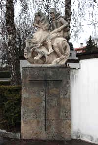 Außen an der Friedhofsmauer drei Gedenktafeln, daneben Steinplastik auf einer Säule "Ritter kämpft mit Drachen".