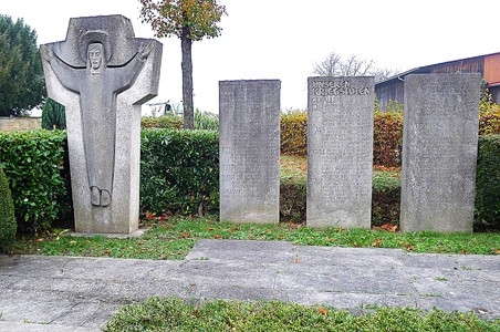 Massives Hochkreuz und drei seitlich davon gruppierte Stelen aus Beton mit den kriegschronologisch angegebenen