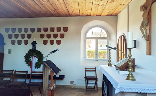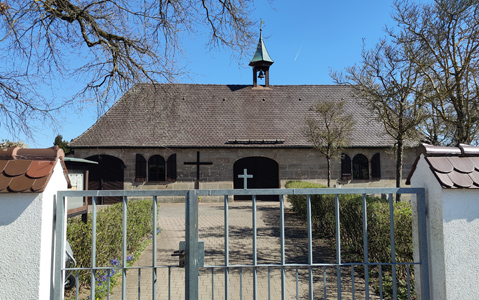 In der verschlossenen Aussegnungshalle befindet sich eine Gedenktafel für die Gefallenen und Vermissten