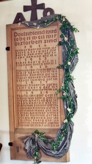 des 1. Weltkriegs. Für den 2. Weltkrieg wurde für jeden Namen ein kleines Schild aus Holz angefertigt.