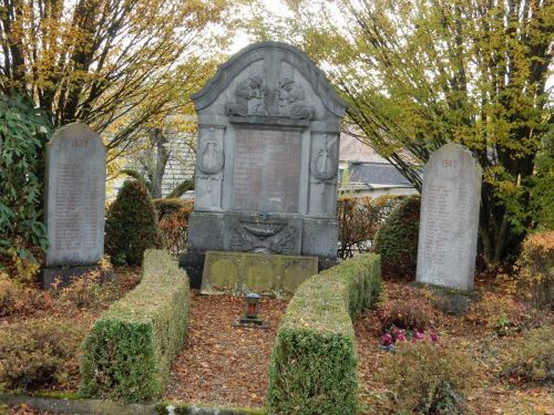 Das Kriegerdenkmal steht auf dem Friedhof. In dessen Mitte eine Gedenkplatte für die Gefallenen des Ersten Weltkrieges.