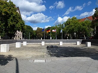 abgesenkten, 24 x 28 m großen Platzfläche aus Granit, die eine niedrige Umfriedung aus