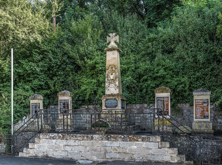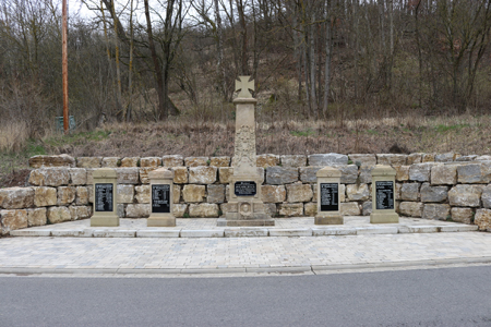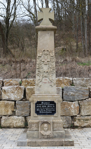 Obelisken mit aufgesetztem Deutschen Kreuz auf einem Postament mit angebrachten schwarzen Inschriftentafeln.
