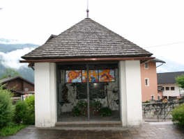 Bei der Kirche vorne offene Gedenkkapelle, durch schmiedeeisernes Gitter versperrt,