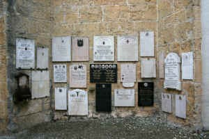 Außen an der Kirche in einer Nische zwischen den Stützpfeilern mehrere Gedenktafeln.