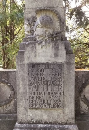 Denkmal Erster Weltkrieg: Podest mit Bronzefigur eines nackten Kriegers, 1925 errichtet.