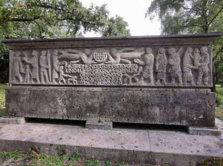 Denkmal Zweiter Weltkrieg: Mit Reliefs und Inschriften verzierter Sarkophag.