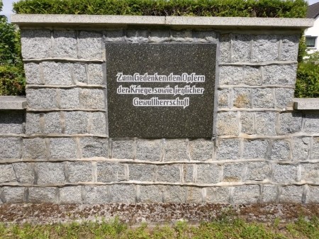 Am Ende des Grabfeldes mit den Kriegstoten des Zweiten Weltkrieges befindet sich in die Mauer eingelassen eine schwarze Gedenkplatte mit Inschrift.