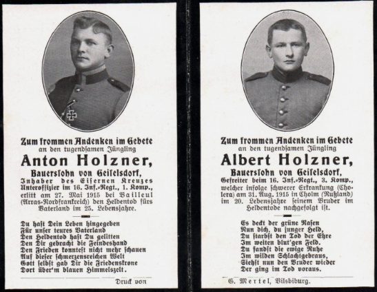 | Unteroffizier der Reserve | HOLZNER | Anton | 04.02.1891 Geiselsdorf | 27.05.1915 an der Westfront bei Bailleul (Arras) in Frankreich |