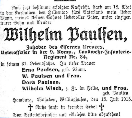 | Unteroffizier | PAULSEN | Wilhelm | 31. Lj. | 18.05.1915 Karpathen |