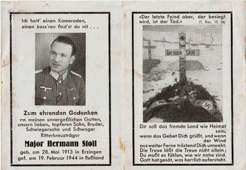 | Major | STOLL | Hermann | 28.05.1913 Erzingen | 19.02.1944 Rogachev, Russland | Gren.‑Rgt. 521, Kdr. II. Batl. | Ritterkreuz 09.06.1944 posthum |