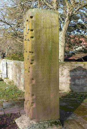 Ein Sandsteinblock, vorne mit herausgearbeiteten Kreuzen und einer Inschrift.