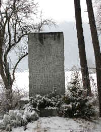 An einem Feldrand außerhalb von Vomp aufrecht stehender Granitstein mit Inschrift.