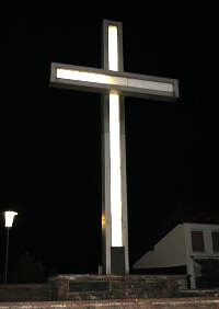 von innen beleuchtetes Metallkreuz und am Sockel Gedenktafel.