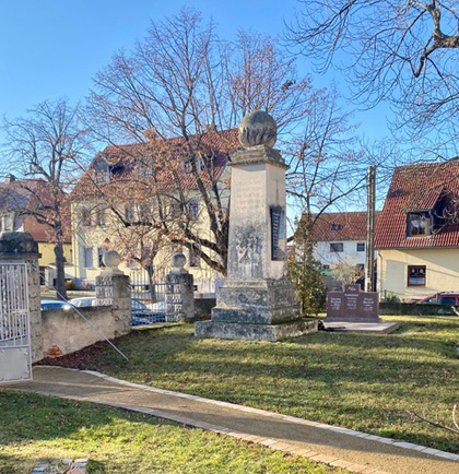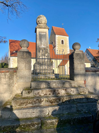 Verputzte Stele auf dem Kirchhof. Eine stilisierte Kugel bekrönt das Denkmal.