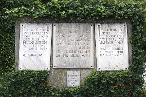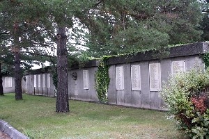Im Friedhof zwei Betonwände mit 26 Gedenktafeln mit Namen, an der Stirnseiten Gedenktafeln mit Inschriften.