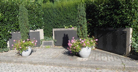 Im Friedhof Denkmal drei Steinplatten mit den Namen der Gefallen und Vermissten des Zweiten Weltkriegs,
