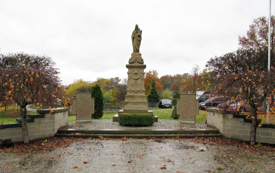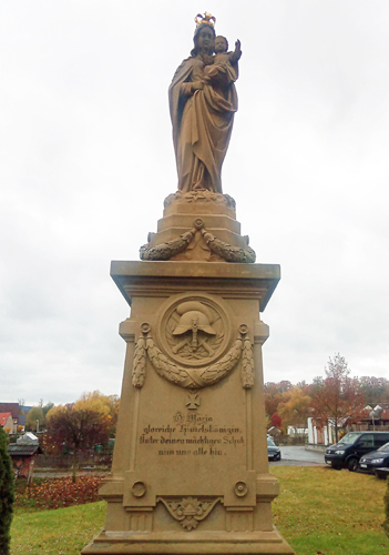 Kriegerdenkmal an der Hauptstraße von Wülfershausen. Patrona Bavariae-Statue auf einem hohen Inschriftensockel.