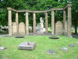 Säulenbogen auf dem Zuffenhausener Friedhof, in der Mitte die Skulptur eines Trauerpaares,