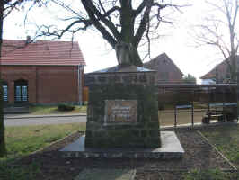 Natursteindenkmal ohne Namen mit eingelegter Granitplatte. Oben auf dem Denkmal ein Adler, dem der Kopf fehlt