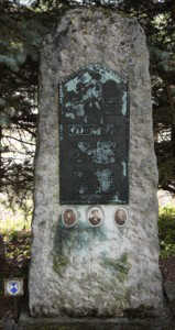 Bruchstein unter Bäumen, Metallplatte mit Inschrift.