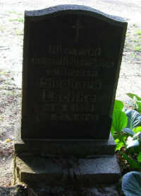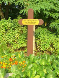 mit den Namen. Links vom Eingang ein Holzkreuz mit Inschrift in