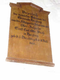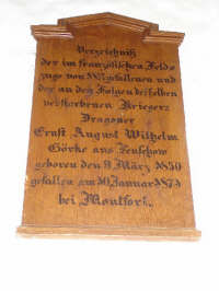 | | Herzberg, Landkreis Parchim, Mecklenburg-Vorpommern: Holztafeln in der Kirche   Inschriften: 1808-1815: Verzeichniß der decorierten Veteranen der Gemeinde Herzberg aus den Feldzügen der Jahre 1808-1815 (1 Name) 1870/71: Verzeichniß der im französischen Feldzuge von 1870/71 gefallenen und der an den Folgen desselben verstorbenen Krieger: (1 Name) | Namen der Gefallenen & Veteranen: 1808-1815: Dienstgrad | Name | Vorname | Geburtsdatum & Ort | Todesdatum | Ober-Inspektor | SACH | Ernst Carl Otto | 05.12.1795 Herzberg | 16.07.1867 | 1870/71: Dienstgrad | Name | Vorname | Geburtsdatum & Ort | Todesdatum & Ort | Dragoner | GÖRKE | Ernst August Wilhelm | 09.03.1850 Lenschow | 30.01.1871 bei Montfort | Datum der Abschrift: 07.09.2007 Beitrag von: Karin Offen