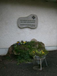 der Wand der Trauerhalle wurde eine Gedenkplatte mit Inschrift und Eisernem
