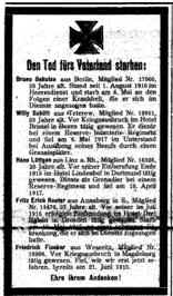 Landsturmmann | SCHULZE | Bruno | 25.05.1897 Berlin | 06.05.1917 | ruht auf der Kriegsgräberstätte in Berlin-Neuk.-Garnisonfriedhof (Bundesrepublik Deutschland). Endgrablage: Feld K2 Reihe 12 Grab 31 20 Jahre alt |