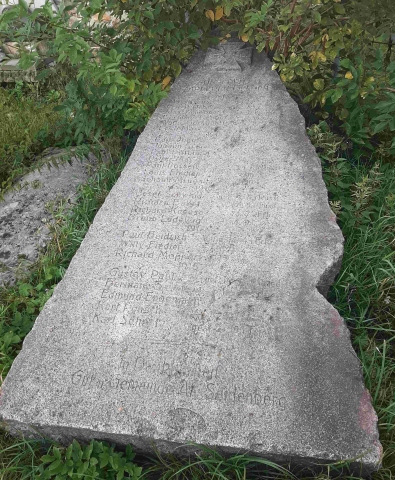 Alter Gedenkstein von 1942, abgestellt am Kirchturm.