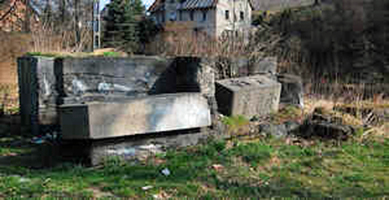 Die zerlegten Teile des Denkmals lagen lange Zeit hinter einem Supermarkt (siehe Foto von 2009), teils mit Schutt und Schmutz bedeckt.