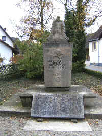 Steinernes Denkmal an einer Wegkreuzung (Ecke Ernst-Scheffelt-Strasse / Lipburger Strasse), gekrönt von einem Knaben, der eine Girlande um die Schultern trägt. Die Vorderseite zeigt einen Stahlhelm und das Ortswappen. Auf der Rückseite ist ein Schwert mit einem Lorbeerzweig. Auf der linken Seite ist ein granatenähnlicher Gegenstand abgebildet, darüber ein gezackter Blitz. Die rechte Seite zeigt wohl eine Handgranate und die Namen und Todesdaten der Gefallenen des 1. Weltkrieges.Vor dem Denkmal liegt eine Steinplatte mit den Namen und Todesdaten der Gefallenen des 2. Weltkrieges. Zusätzlich Hinweise zu Soldaten von privaten Gedenksteinen.