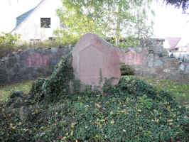 Behauener Findling neben der Kirche, dahinter halbkreisförmige