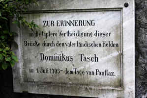 Zur Erinnerung an die tapfere Vertheidigung dieser Brücke durch den vaterländischen Helden Diminikus Tasch am 1. Juli 1703 - dem Tage von Pontlaz.