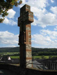 Steindenkmal in Kreuzform vor der Kirche