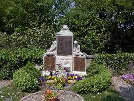 oben ein Stahlhelm im Lorbeerkranz. Die Namen der Opfer des 1. und 2. Weltkrieges sind auf drei Metalltafeln vermerkt. Vor