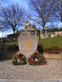 Bei der Kirche auf einem Steinsockel zwei Soldaten mit Stahlhelm, einer davon verwundet hingestreckt; vorn die Namen des 1. Weltkrieges, links und rechts die Namen des 2. Weltkrieges. Signatur Adolf Riedlin (ein Künstler aus dem Markgräflerland). Daneben stehen drei niedrige Steinkreuze ohne Beschriftung. Zusätzlich Hinweise zu Soldaten von privaten Gedenksteinen.
