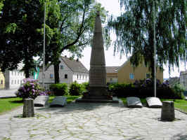 Steinsäule mit Kreuzabschluss. Grünanlage in der Ortsmitte.
