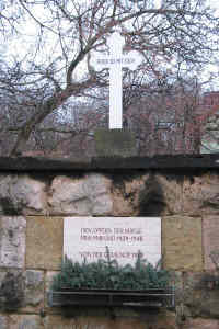 steht ein weißes Kreuz mit Aufschrift, unterhalb hängt eine