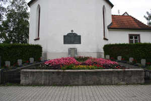der Kirche; Gedenktafel (1. Weltkrieg) an der Kirchenmauer und Steinkreuze in