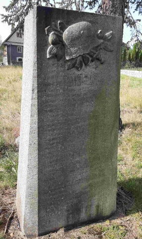Aufgerichtete Steinplatte mit Relief eines Stahlhelms mit Schwert und Lorbeer im oberen Bereich. Die Inschriften sind schwer lesbar.