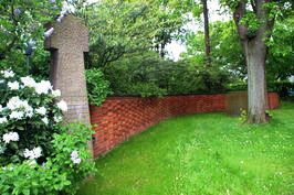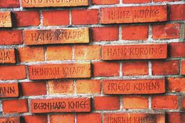 Klinkermauer. In vielen Steinen sind die Namen der Opfer des 2. Weltkriegs eingraviert. Die