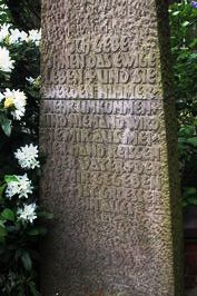 Inschrift wird auf einem hohen steinernen Kreuz wiedergegeben.