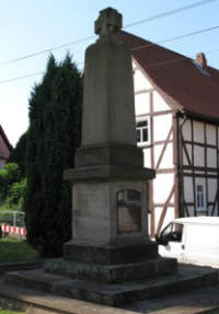 Das Denkmal steht vor der Kirche. Auf einem Sockel, der auch die