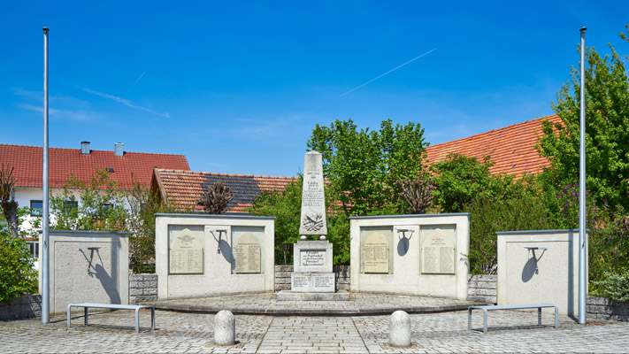 Kriegerdenkmal, in der Mitte ein konisch zulaufender Obelisk mit Inschriften und Verzierungen
