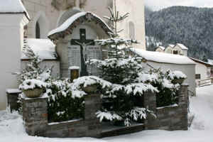 Aussen an der Friedhofsmauer; in der Mitte Kruzifix, darüber